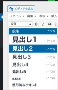 また、メニュー項目「段落」から選択出来る、見出し<h2>小見出し<h3><h4>も、効果的に使いましょう。話の展開や、枝わかれする場合において、視覚的にもわかりやすくなります。